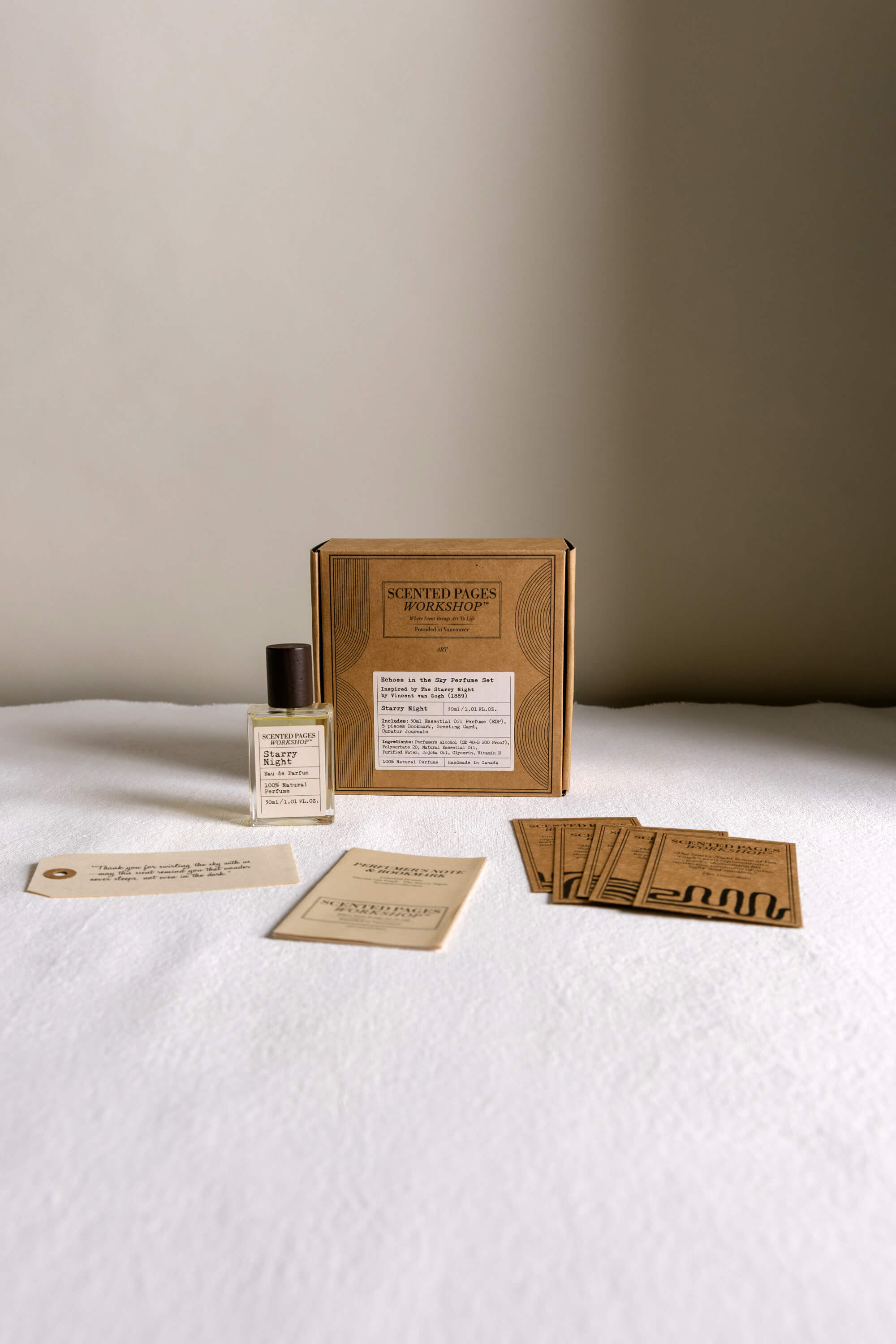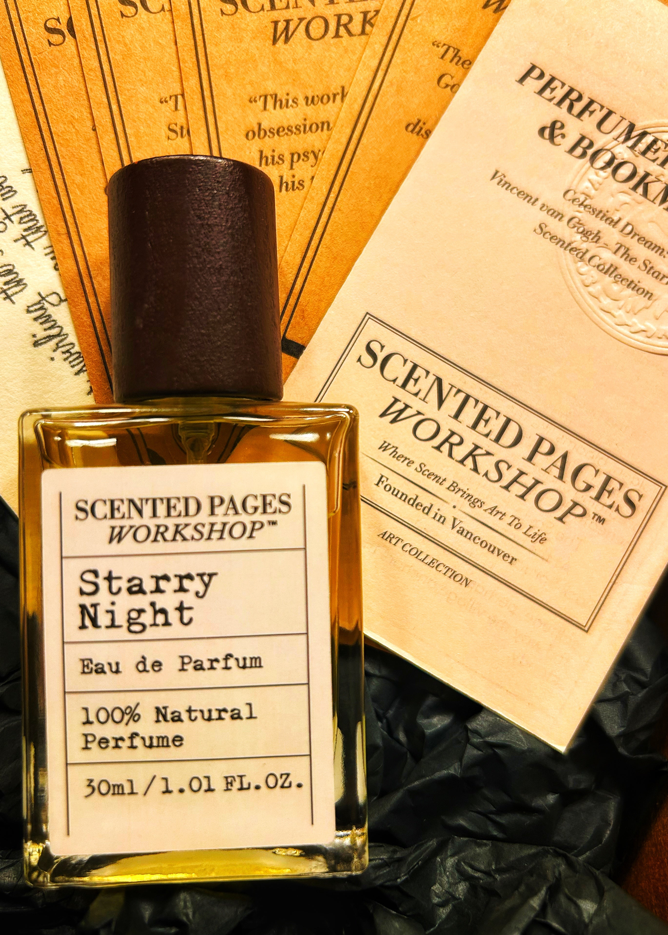 Bergamot, peppermint, and fragonia flicker like stars in motion. A radiant heart of lemongrass, blue lotus, jasmine, and geranium whirls beneath, laced with ylang ylang and eucalyptus. The base glows with myrrh, frankincense, spikenard, fir, and cypress—anchoring Van Gogh’s cosmic chaos in spiritual stillness.